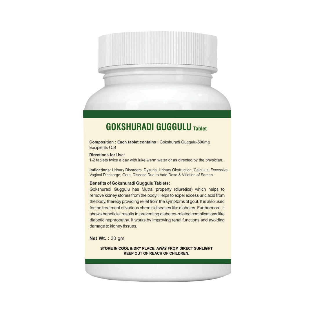 Gokshuradi Guggulu has Mutral property (diuretics) which helps to remove kidney stones from the body. It helps to expel excess uric acid from the body, thereby providing relief from the symptoms of gout. It is also used for the treatment of various chronic diseases like diabetes. Furthermore, it shows beneficial results in preventing diabetes-related complications like diabetic nephropathy. It works by improving renal functions and avoiding damage to kidney tissues.